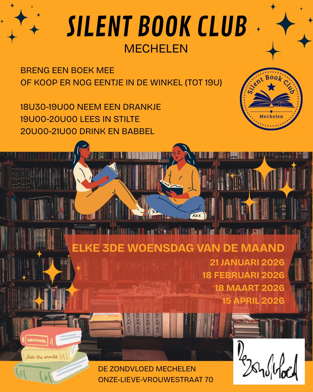 Elke derde woensdag van de maand komen we samen in de boekenbar van boekhandel De Zondvlod om samen of apart te lezen. Je kan je eigen boek meebrengen, of eentje kopen in de winkel om goed te starten. De winkel blijft open tot 19 uur en sluit dan om ons van 19 uur tot 20 uur op ons gemak en in stilte te laten lezen. Heb je toch zin in een streepje muziek dan mag je natuurlijk altijd je hoofdtelefoon opzetten of via je earbuds luisteren. Vanaf 20 uur is er tijd en ruimte voor een babbel achteraf en een drankje.