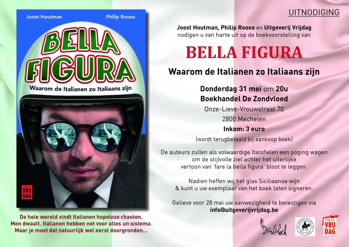 De auteurs, Joost Houtman en Philip Roose, zullen als volwaardige Italofielen een poging wagen om de stijlvolle ziel achter het uiterlijke vertoon van 'fare la bella figura' bloot te leggen. Chris Dusauchoit zal het gesprek aan elkaar praten. Nadien heffen wij een glas Siciliaanse wijn en kunt u uw exemplaar van het boek laten signeren.